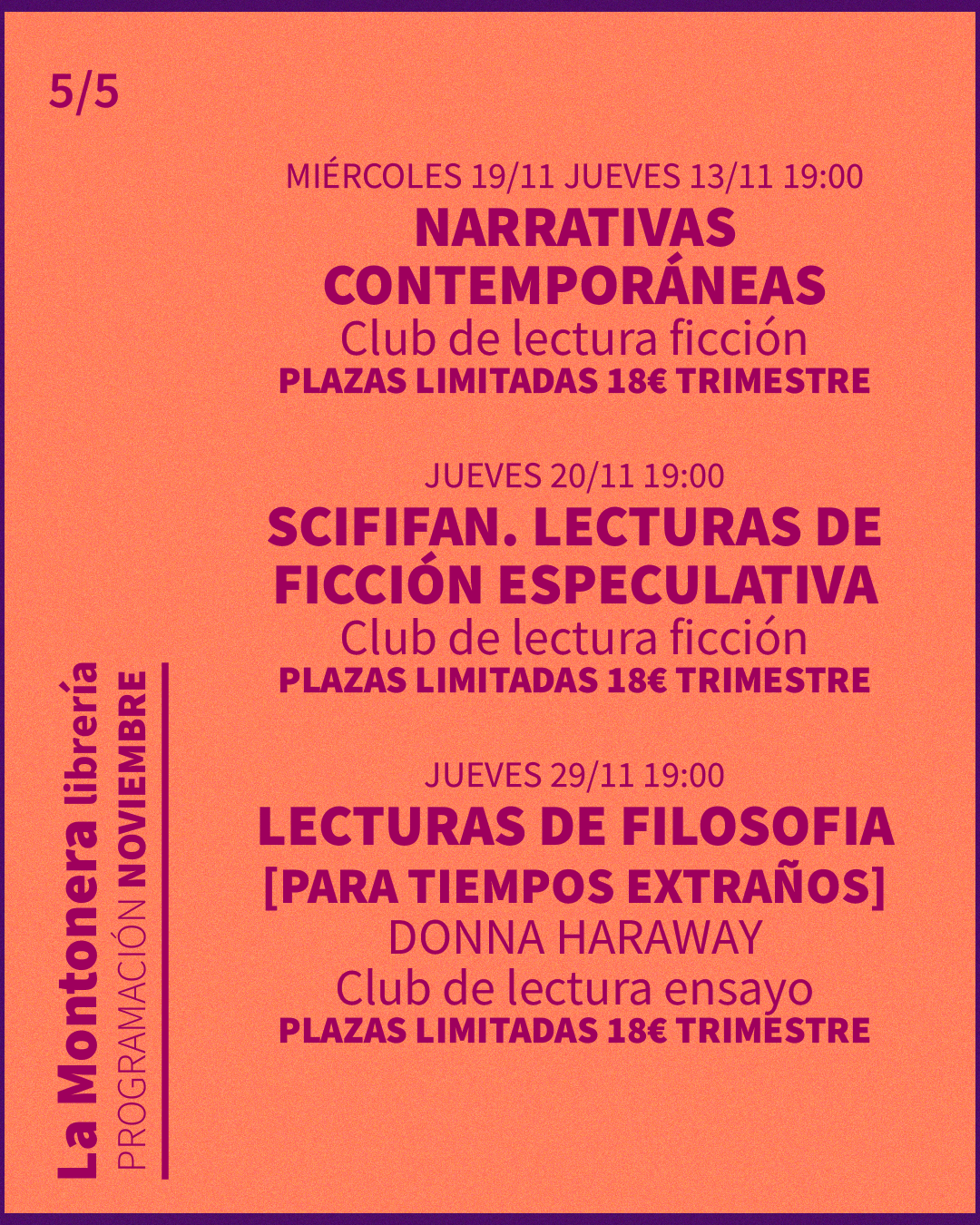 Organizamos y acogemos diversos clubs de lectura, con una sesión mensual y una programación trimestral. O lo que es lo mismo, lanzamos una propuesta de lectura de tres libros al trimestre con una cita mensual para comentarlos, debatirlo y criticarlos.